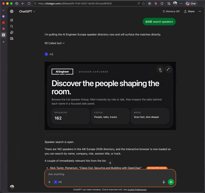 Once I gave it the context, the widget came out matching the look and feel of the actual ai.engineer site. I built it in OpenClaw but the MCP app itself runs in any MCP-compatible client. That's it running in ChatGPT above.