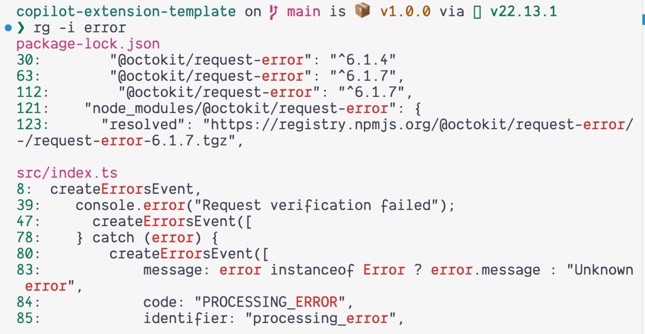 In this screen shote, I’m in my copilot-extension-template project and I want to see where the word error is.