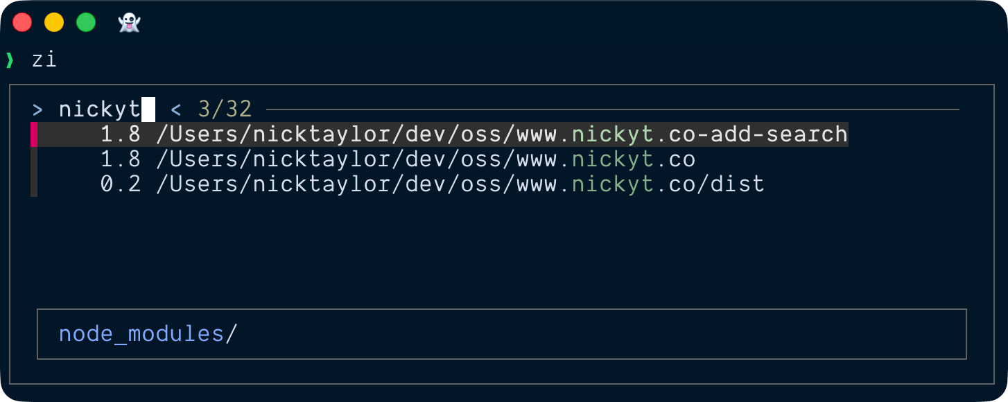 The interactive mode is the real winner. Type zi foo and you get a fuzzy finder showing all matching directories. Pick with your arrow keys. Note, you need to have fzf installed to use zi.